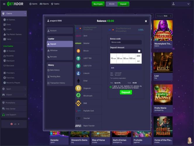 Казино Betador поддерживает различные популярные криптовалюты и способы оплаты криптовалютой , а также традиционные банковские методы, такие как дебетовые и кредитные карты, известные электронные кошельки и другие системы онлайн-платежей.