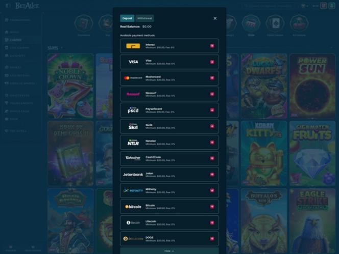 BetAlice включает разделы «Казино», «Live-казино» и «Спорт» , поэтому у игроков будет возможность изучить различные жанры казино, попробовать разные виды бонусов и принять участие в VIP-программе.