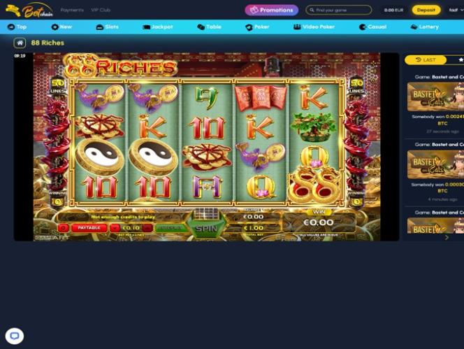 BetChain Casino — это онлайн-казино, открытое в 2014 году, которое предоставляет возможность совершать финансовые транзакции в биткоинах игрокам по всему миру, включая Соединенные Штаты. Казино предлагает небольшой выбор игр, но получило хорошие отзывы за очень быстрые выплаты выигрышей.