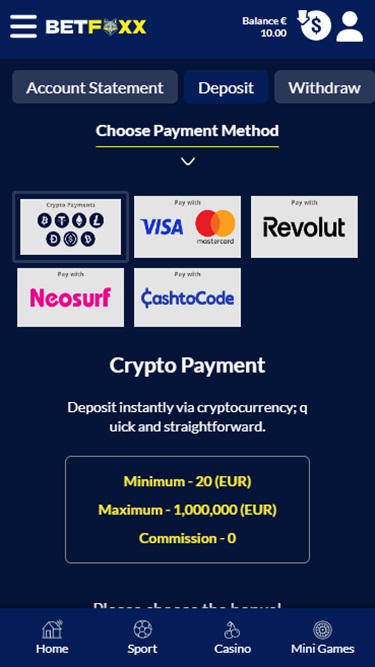 В кассе казино представлен солидный набор способов оплаты , хотя доступные варианты зависят от того, из какой юрисдикции вы играете. Но не стоит беспокоиться — выбор достаточно широк, независимо от того, из какой юрисдикции вы заходите на BetFoxx.