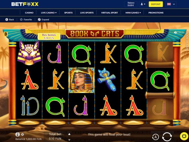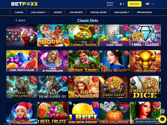 Оператор предлагает коллекцию из почти трех тысяч игр, и мы уверены, что игрокам никогда не надоест их изучать. Среди самых популярных слотов на BetFoxx — 100 Cats, 20 Diamonds, Almighty Sparta, Aloha King Elvis, Buffalo Hold and Win, Book of Cats, Bone Bonanza, Dragon's Element Deluxe, Gates of Olympus, Grace of Cleopatra, Hot Triple Sevens, Lucky Oasis, Mega Greatest Catch Bonus Buy, Miss Cherry Fruits Jackpot Party, Rise of Triton и многие другие.