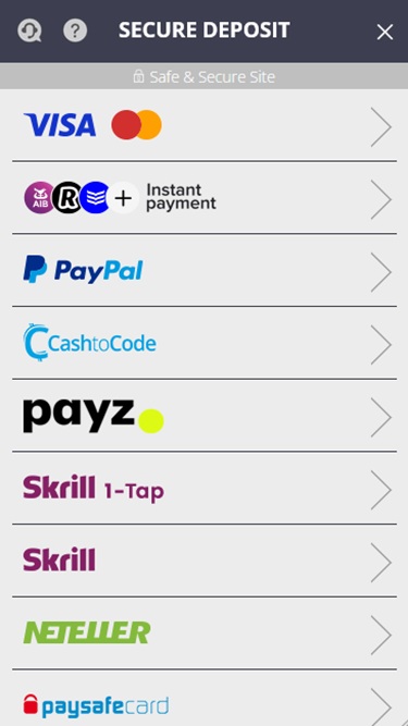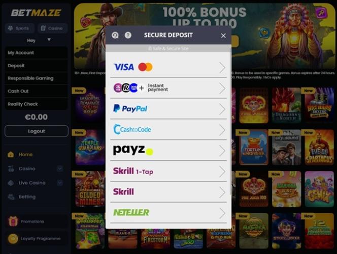 Betmaze предлагает различные традиционные способы оплаты , включая кредитные и дебетовые карты, электронные кошельки, такие как Skrill и Neteller, и другие варианты. Если вас интересуют платежи с использованием криптовалют, обратите внимание, что на момент написания этого обзора методы криптобанкинга были недоступны.