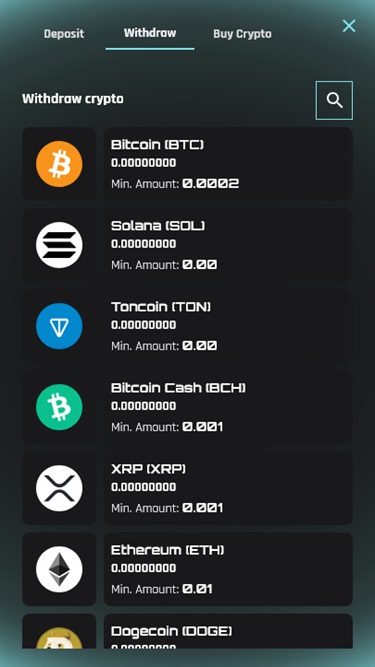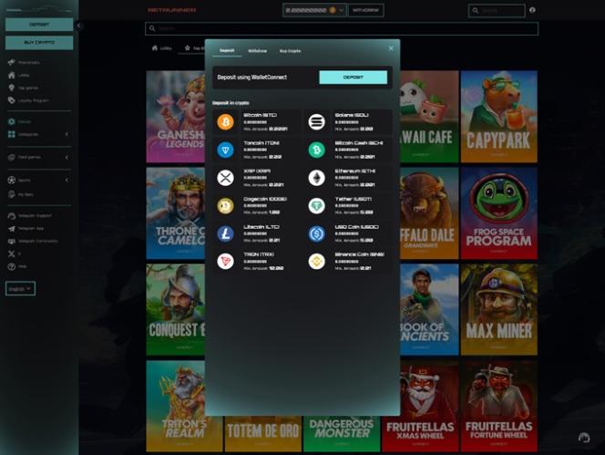 Как мы уже упоминали, Betrunner Casino — это сайт азартных игр, работающий исключительно с криптовалютами, где игроки могут вносить и выводить средства, используя множество криптовалют, включая Bitcoin , Bitcoin Cash , Cardano , Dogecoin , Ethereum , Solana , Tether , Toncoin , Tron , USD Coin и Ripple . Те, у кого еще нет криптовалютного кошелька, могут приобрести криптовалюту непосредственно на сайте, используя Visa и Mastercard .