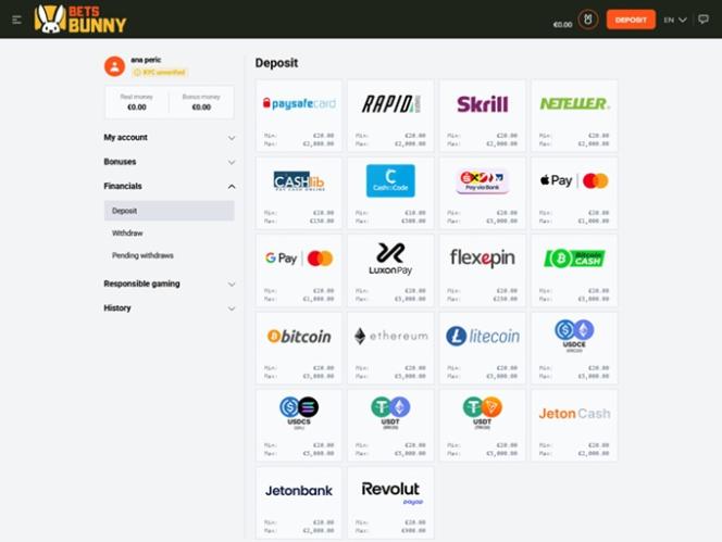 Что касается бонусов и акций, игроки Bets Bunny найдут множество выгодных предложений, независимо от того, решат ли они провести время за играми в казино или делать ставки на популярные спортивные матчи. После создания аккаунта вы сможете получить щедрый приветственный пакет, призванный улучшить ваши первые сессии, а позже — несколько еженедельных бонусов и акций, которые не дадут вам заскучать.