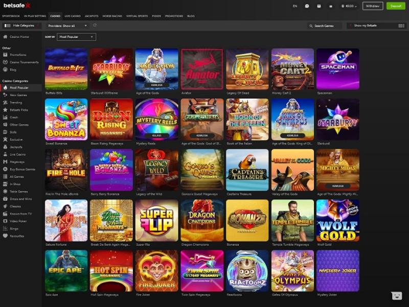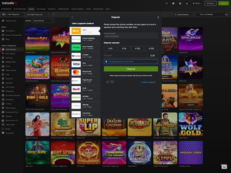 Казино Betsafe работает на программном обеспечении Microgaming, Net Entertainment, Playtech, 1x2gaming, Barcrest, Big Time Gaming, ELK Studios, Evolution Gaming, EYECON, Genesis Gaming, Habanero Systems, iSoftBet, lightningboxgames, Novomatic, Oryx, Play'n GO, playson, Quickspin, Rabcat, Relax Gaming, Thunderkick, Yggdrasil, Endorphina, Wazdan, Realistic Games, GameArt, Betgames, Booming Games, Stakelogic, Pragmatic Play, Nolimit City, Felt Gaming, Red Tiger Gaming, IGT, Red Rake Gaming, Skillzzgaming, Fantasma Games, FunFair, SYNOT Games, FUGA Gaming, Kalamba, Sigma Gaming, Skywind, Triple Edge Studios, Northern Lights Gaming, Stormcraft Studios, Switch Studios, Electric Elephant Games, Pocket Games Soft, Bulletproof Games, All41 Studios, Gluck Games, Gameburger Studios, Pulse 8 Studios, Neon Valley Studios, Golden Rock Studios, Spearhead Studios, Shuffle Master, SpinPlay Games, Real Dealer Studios, GONG Gaming, Blue Guru Games, Lady Luck Games, Buck Stakes Entertainment, Design Works Gaming, Games Global, Wizard Games, 2by2 Gaming, Ainsworth, Ash Gaming, Bally Technologies, bluberi, Blueprint Gaming, Greentube, Leander Games, NextGen, Pariplay, Push Gaming, WMS, Inspired Gaming, Genii, SG Interactive, Gamomat, Red7Mobile, CORE Gaming, Scientific Games, RFranco Group, Side City Studios, Reel Time Gaming, MGA, Bally Wulff, Iron Dog Studio, Old Skool Studios, Foxium, Just For The Win, The Games Company, Reflex Gaming, MetaGU, PearFiction Studios, Apollo Games, Wild Streak Gaming, Slingshot Studios, Fortune Factory Studios, Jade Rabbit Gaming, RubyPlay, 4ThePlayer, AvatarUX, Gamevy, Crazy Tooth Studio, NetGaming, High 5 Games, YoloPlay, ReelPlay, Alchemy Gaming, Rarestone Gaming, BB Games, Snowborn Games, Boomerang Studios, Hacksaw Gaming, Max Win Gaming, Gold Coin Studios, Bang Bang Games, Slotmill, SilverBack Gaming, Peter And Sons, Eurostar Studios, Aurum Signature Studios, Lucksome Gaming, Religa, Area Vegas, RAW iGaming, Apparat Gaming, INO Games, Live 5, Indigo Magic, Kitsune Studios and Sneaky Slots , которое предоставляет казино сотни игр в своей виртуальной библиотеке. Игроки также найдут на сайте ставки на спорт, покер и игры с живыми дилерами.