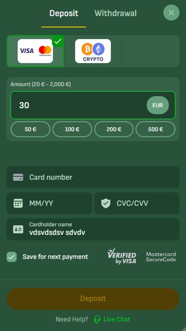 Оператор предоставляет игрокам традиционные и современные способы оплаты. Visa , Mastercard , банковский перевод и MiFinity — это лишь некоторые из доступных вариантов, но вы также можете вносить и выводить средства с помощью криптовалют, таких как Bitcoin , Ethereum , Tether и Tron .