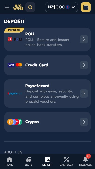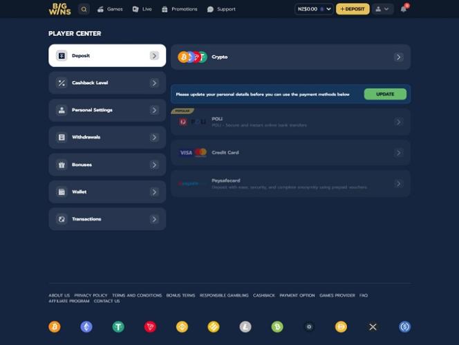 Поклонники криптовалют будут рады узнать, что казино BigWins позволяет своим игрокам использовать множество различных криптовалют . Помимо этих способов оплаты, доступны также Visa, MasterCard, банковский перевод и Paysafecard в качестве основного способа оплаты. В целом, здесь достаточно способов оплаты, чтобы все игроки могли использовать их для пополнения счета и вывода средств. Эти варианты важны, поскольку в конечном итоге они могут напрямую повлиять на количество игроков, присоединяющихся к казино.