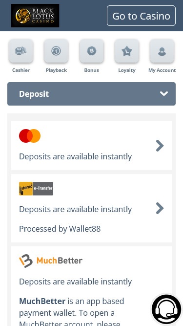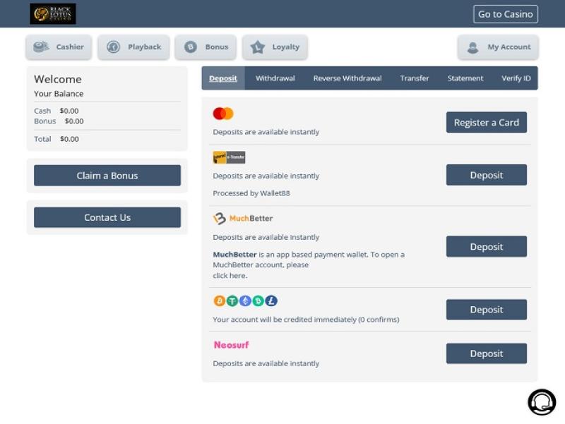 Банковская система в Black Lotus Casino довольно неплохая: сайт предлагает пополнение и вывод средств с помощью чеков, кредитных карт, электронных кошельков и биткоинов. Время обработки выигрышей составляет 48 часов, но выплаты с электронных кошельков и биткоинов производятся мгновенно. Другие способы вывода занимают больше времени, но это скорее ограничение самих методов, чем особенностей казино. Следует отметить, что казино устанавливает лимит на вывод средств в размере 1500 долларов, при этом более крупные суммы необходимо разделить на несколько частей.
