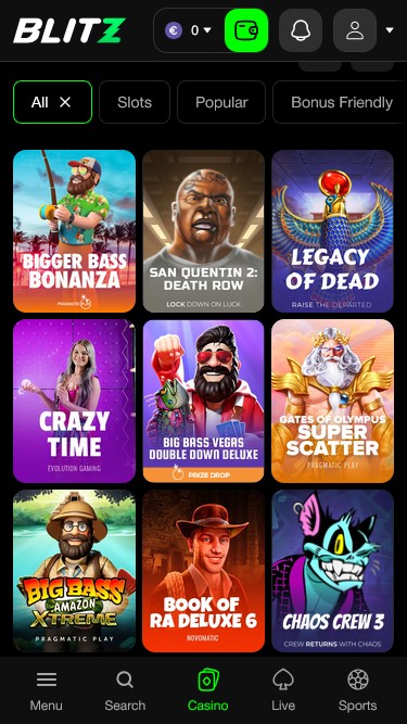 Blitz.Bet — это крипто-дружественное онлайн-казино и букмекерская контора, предлагающая широкий выбор игр и спортивных событий. От слотов и классических настольных игр, таких как баккара, блэкджек или рулетка, до ставок на ваши любимые спортивные команды — вы без труда найдете что-нибудь по своему вкусу!