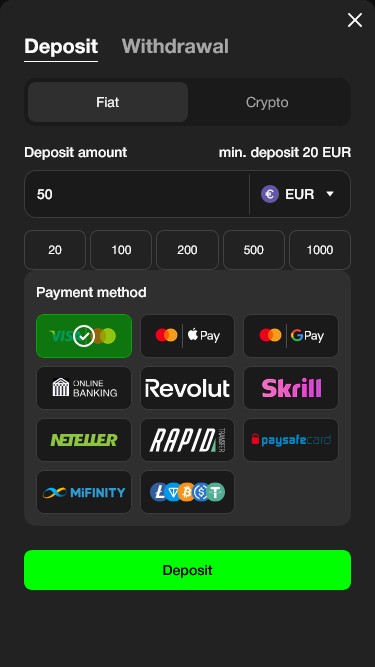 💰 Мин. депозит€10 (Crypto) / €20