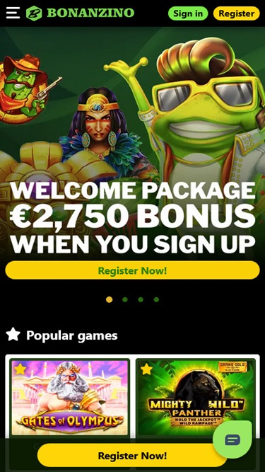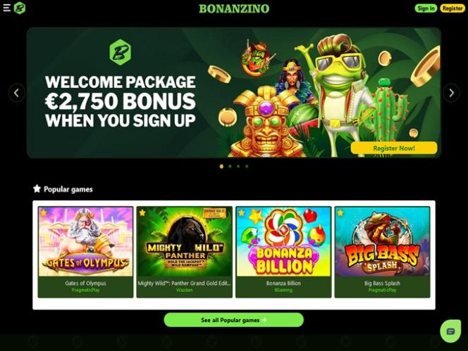 При входе в Bonanzino игроков встречает минималистичная главная страница, которая не пытается перегрузить их ненужной информацией, а сразу же показывает прокручиваемый баннер с самыми выгодными акциями, в которых они могут принять участие.