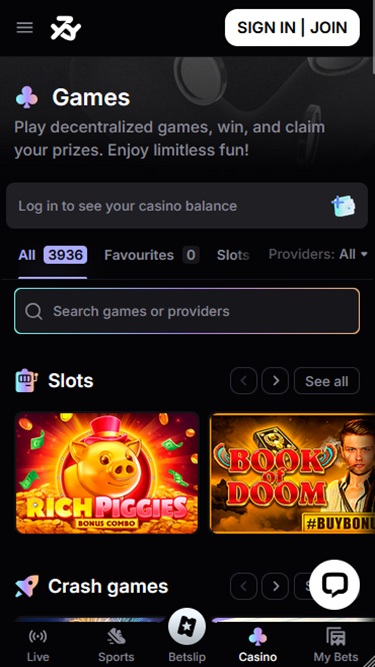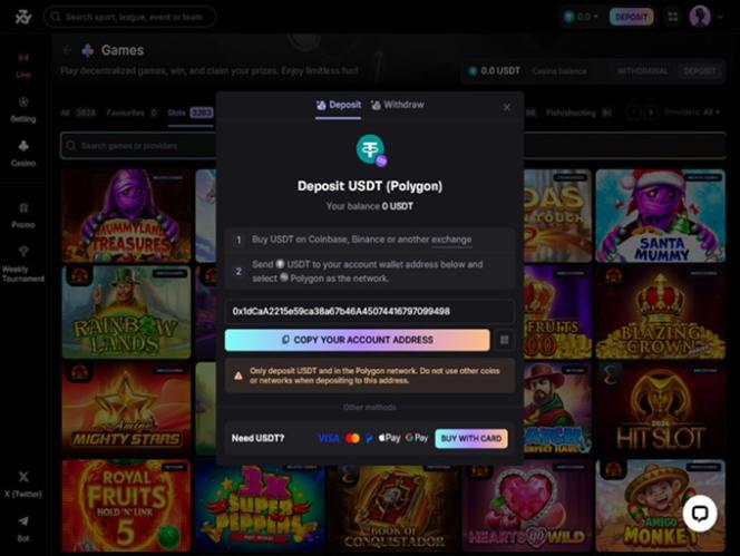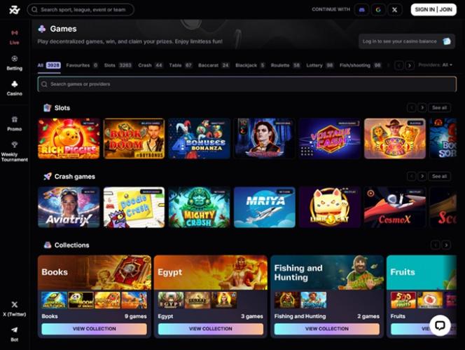 Это казино — платформа, ориентированная исключительно на криптовалюты, что означает, что каждая ставка прозрачна и поддается проверке в блокчейне, а также работает на основе Azuro — ведущего децентрализованного протокола для ставок, гарантирующего доверие и надежность.