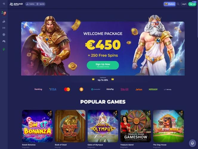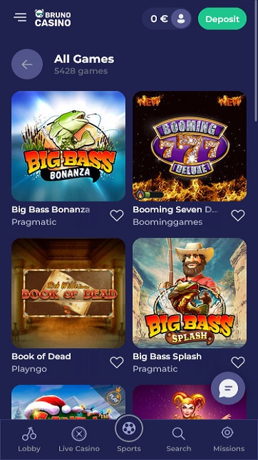 В казино BrunoCasino доступны следующие категории игр : Избранное, Лучшие, Все, Live, Слоты, Рулетка, Букмекерские конторы, Джекпоты и Настольные игры.