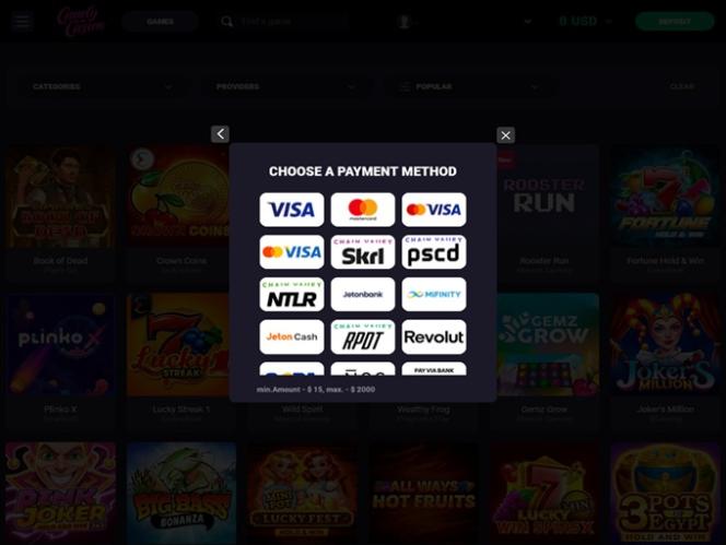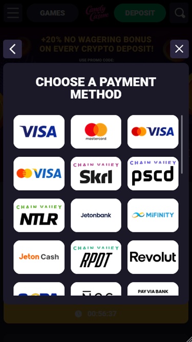 Что действительно повышает привлекательность Candy Casino, так это разнообразие способов оплаты . От карт Visa и MasterCard до цифровых кошельков, таких как Skrill и Neteller , и даже криптовалют, таких как Bitcoin и Ethereum, банковский интерфейс разработан для удобства. Внесение депозитов происходит быстро, а вывод средств — после подтверждения — обычно обрабатывается в течение 24 часов в рабочие дни.