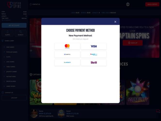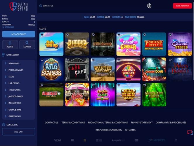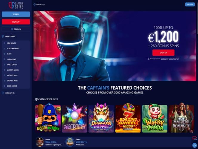 Казино Captain Spins работает на платформе Microgaming, Net Entertainment, Evolution Gaming, EYECON, Play'n GO, playson, Rabcat, Relax Gaming, Wazdan, Pragmatic Play, Nolimit City, Red Tiger Gaming, Fantasma Games, Kalamba, Triple Edge Studios, BGAMING, Northern Lights Gaming, Stormcraft Studios, Switch Studios, Electric Elephant Games, All41 Studios, Gameburger Studios, Pulse 8 Studios, Neon Valley Studios, Golden Rock Studios, SpinPlay Games, GONG Gaming, Blue Guru Games, On Air Entertainment, Buck Stakes Entertainment, Games Global, Push Gaming, Inspired Gaming, Old Skool Studios, Foxium, Just For The Win, Storm Gaming Technology, PearFiction Studios, Wild Streak Gaming, Slingshot Studios, Fortune Factory Studios, AvatarUX, Crazy Tooth Studio, ReelPlay, Alchemy Gaming, Snowborn Games, Hacksaw Gaming, Max Win Gaming, SilverBack Gaming, Peter And Sons, Aurum Signature Studios, Area Vegas, Wishbone Games, Spribe, Print Studios, HammerTime Games, Four Leaf Gaming, INO Games, Nailed It! Games, Neko Games, Reel Kingdom and Oros Gaming , и для доступа к сайту используется веб-платформа. Игроки смогут легко перемещаться по сайту и находить любые интересующие их игры. Также предусмотрена поддержка мобильных устройств, позволяющая играть на смартфонах и планшетах.Blackjack