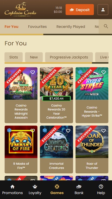 СреднийCaptain Cook's Casino предлагает игрокам разнообразный набор. Выбор игр — определенно сильная сторона, с большим выбором слотов, настольных игр и видеопокера, чтобы развлечь вас.