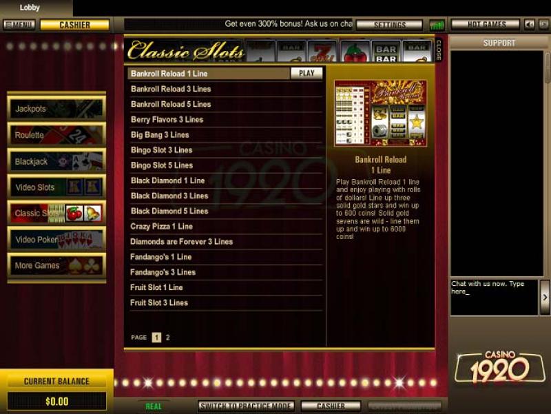 В казино 1920 представлен широкий выбор игровых автоматов, включая десятки видеослотов и небольшой ассортимент классических игр. Также в казино есть прогрессивные джекпоты, где можно выиграть миллионы долларов.