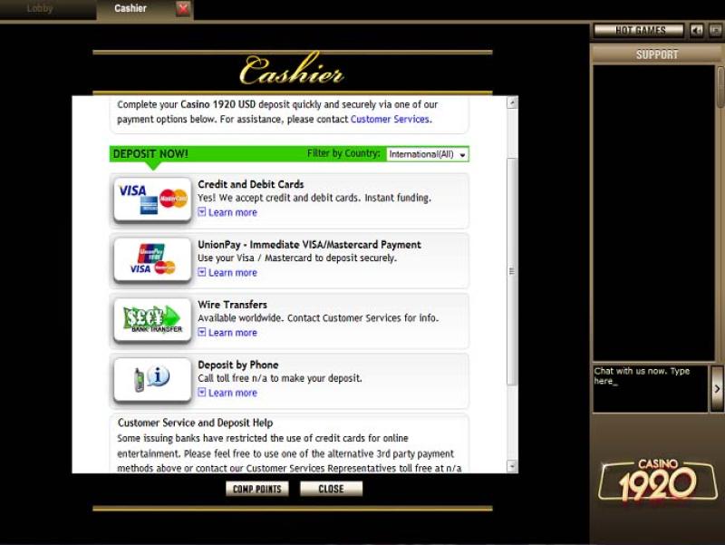Варианты банковских операций в Casino 1920