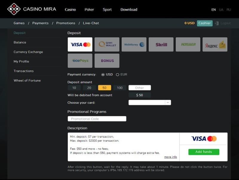 Хотя казино Mira не предлагает традиционную программу лояльности, оно предоставляет кэшбэк за депозиты свыше 20 долларов, начисляя баллы за ставки, сделанные в казино.