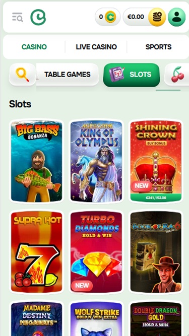 В правом верхнем углу вы найдете кнопку «Баланс счета» и кнопку пополнения, которая позволяет быстро пополнить счет, а также кнопку для перехода в свой профиль. Конечно же, есть и строка поиска, позволяющая мгновенно найти ваши любимые игры, провайдеров и категории!