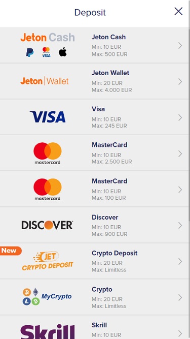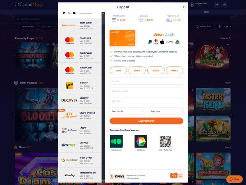 Теперь поговорим о способах пополнения счета. Играя на CasinoMega, вы сможете выбрать один из самых популярных способов внесения депозита, таких как Visa, MasterCard, Jeton, Paysafecard, Skrill и многие другие. Также есть возможность пополнения счета через Neteller , поскольку этот способ стал очень популярен среди многих игроков за последние несколько лет.