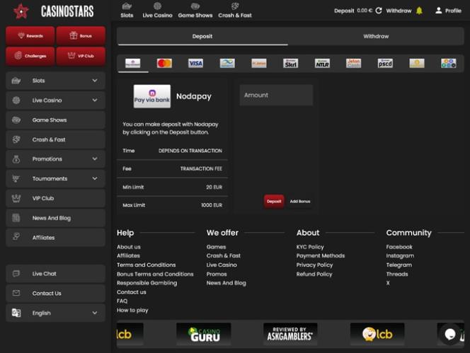 Я присоединился к Casino Stars, потому что увидел их эксклюзивный товар в магазине здесь, на LCB. Мне понравился их выбор игр, и я зарегистрировался. Я играл с 20 бесплатными вращениями без депозитного бонуса, но сумел выиграть у них менее 50 центов, которые я проиграл в той же игре. Я думаю, что их выбор платежей довольно хорош, пока что я не столкнулся с какими-либо проблемами, и бонусы тоже приличные. Единственный недостаток для меня — это их интерфейс — лобби казино кажется немного устаревшим.