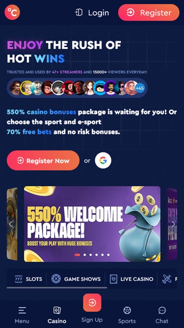 В верхней части главной страницы находится горизонтальное меню, содержащее все категории игр, такие как слоты, игровые шоу, игры с живыми дилерами , настольные игры и моментальные игры. Меню также включает подробные страницы о VIP-системе , наградах и бонусах.