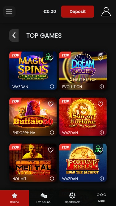 Среди рекомендуемых игровых автоматов: Hot Triple Sevens, Ice Mania, Triple Chili, Book of Cupids, Money Farm 2, Lucky Coins, Nefertiti's Bile, Piggy Holmes, Ali Baba's Riches, Apocalypse Quest, Fortune Tiger Hyperways, Journey To The Gold, Cash Truck, Frutopia, Golden Reindeer, Might Of Ra, The Ultimate 5, African Sunset, Caligula, Magic Dragon, Queen of the Seas, Snowing Luck, Tiger Dance Maxways, Royale House, Sexy Vegas, World War, Gumball 7's, Golden Stone Age, Wild Love, Retro Live, Elemental Gems Megaways, Finnegan`s Banditos, Poseidon's Rising Expanded Edition, Queen Of The Sun - Hold and Win, Mystery of Venice, Cocktail Nights, The Legend of Nezha, Odin's Gamble – Mimir's Well, Andar Nights, Battle Of Emperors, Safecracker. Панк-туалет, Волшебный единорог, Король богатства, Денежная ферма, Кухонная драма - Барбекю-безумие, Октоберфест, Тигр удачи, Волшебный сад, Таверна дракона, Эмо! Богатство, Книга безумия: перезагрузка, Волк, Мега-путешествия, Падение викингов, 40 денежных колокольчиков, Ретро-вечеринка, Карманы богатства...