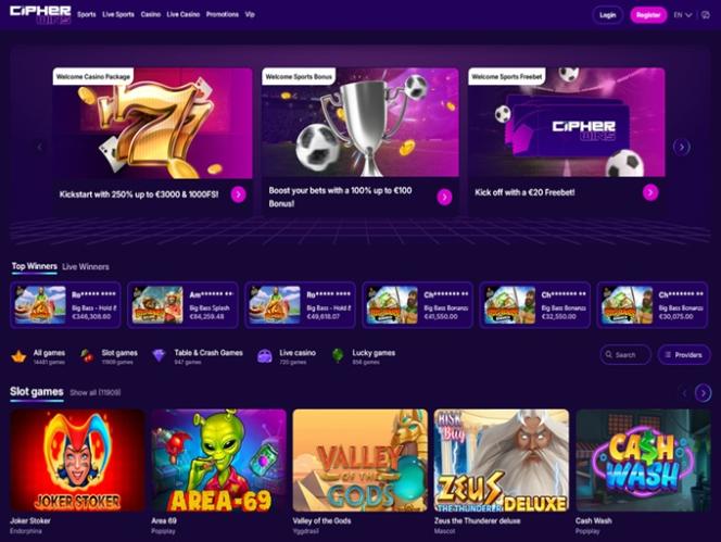 Cipher Wins — это современный игорный сайт с разнообразным выбором игр казино, включая слоты на реальные деньги, игры с живыми дилерами, игры типа Crash и настольные игры. Казино предлагает обширный раздел ставок на спорт, предоставляющий пользователям множество вариантов ставок, а также комплексную программу акций с многочисленными бонусами и предложениями, которыми игроки могут воспользоваться и получить удовольствие.