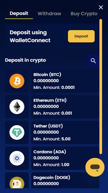 В левой части главной страницы расположено выпадающее меню со всеми разделами, которые вы посетите как игрок, включая доступ к криптомагазину, позволяющему покупать криптовалюты, даже если у вас нет криптокошелька.