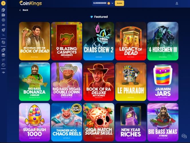 Как мы уже упоминали, казино CoinKings предлагает своим клиентам широкий выбор игровых автоматов . Огромный выбор поставщиков программного обеспечения позволяет им предлагать множество уникальных слотов с интересными механиками, темами и функциями. Среди самых популярных игр, которые стоит попробовать, — Gonzo's Quest, Starburst, Guns N' Roses, Jack Hammer, Fishin' Frenzy Megaways, Book of 99, Hand of Anubis, Buffalo King, Fruit Disco, Sword of Ares, Dork Unit, 777 Fruits.