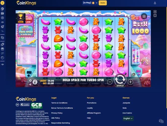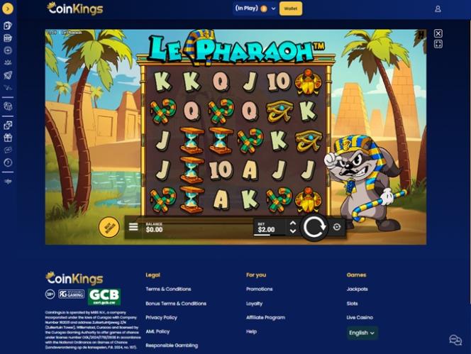 В нижней части главной страницы пользователи могут перейти к важным разделам бренда CoinKings, таким как условия обслуживания, ответственная игра, политика конфиденциальности и условия бонусов. Стоит отметить, что здесь игроки также смогут изменить язык отображения сайта.