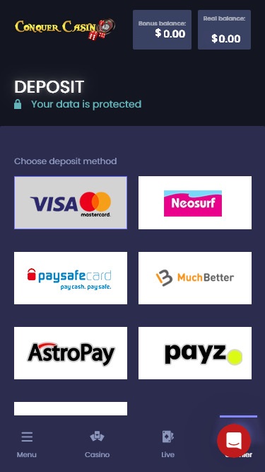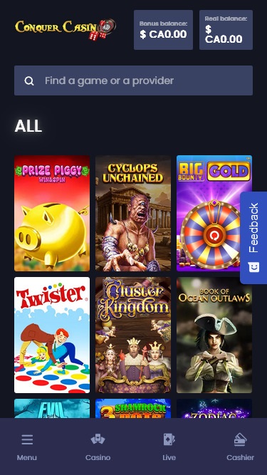 Казино Conquer работает на программном обеспечении Microgaming, Net Entertainment, Playtech, BetSoft, 1x2gaming, Barcrest, Big Time Gaming, ELK Studios, Evolution Gaming, EYECON, Genesis Gaming, Habanero Systems, lightningboxgames, Play'n GO, playson, Quickspin, Rabcat, Rival, Thunderkick, Vivo Gaming, Wazdan, Booming Games, BetConstruct, Pragmatic Play, Nolimit City, IGT, LuckyStreak, Spinomenal, Skillzzgaming, Fugaso, Fantasma Games, Kalamba, Revolver Gaming, Skywind, Triple Edge Studios, Evoplay, Stormcraft Studios, Switch Studios, All41 Studios, TVBet, Gameburger Studios, Pulse 8 Studios, Neon Valley Studios, Super Spade Games, Shuffle Master, SpinPlay Games, Games Global, 2by2 Gaming, Blueprint Gaming, Games Warehouse, Leander Games, NextGen, NYX Interactive, ProgressPlay, Tom Horn Gaming, WMS, Inspired Gaming, Genii, Red7Mobile, CORE Gaming, Scientific Games, Iron Dog Studio, Foxium, Betdigital, Just For The Win, PearFiction Studios, Slingshot Studios, Fortune Factory Studios, Gamevy, Crazy Tooth Studio, ReelPlay, Alchemy Gaming, SimplePlay, Gold Coin Studios and Half Pixel Studios , а игры предоставляются через веб-платформу. Игроки также найдут мобильную версию сайта, позволяющую играть как на смартфонах, так и на планшетах.