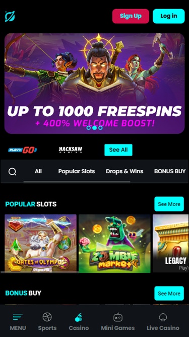 Прибывающих игроков встретит главная страница со всеми необходимыми разделами казино. В самом верху находится движущийся баннер, демонстрирующий все популярные спортивные матчи, которые скоро состоятся, а также различные бонусы и акции, в которых вы можете принять участие.