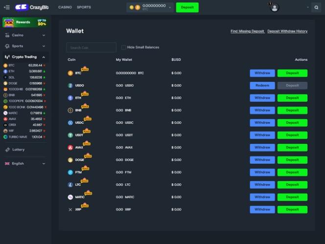 Казино Crazybit.io — это криптовалютная игровая платформа, предлагающая множество различных валют для пополнения и вывода средств. Bitcoin , Ethereum , Solana , Dogecoin , Litecoin , Tether , Ripple и другие доступны для быстрых и анонимных транзакций. К сожалению, традиционные способы оплаты отсутствуют.