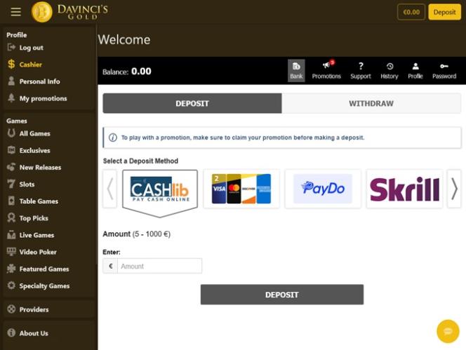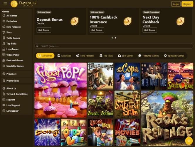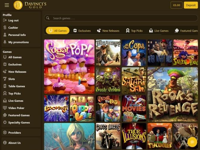 Казино DaVinci's Gold работает на программном обеспечении BetSoft, Genesis Gaming, Rival, Saucify, Spinomenal, Radi8 Games, Fresh Deck Studios, Woohoo Games, Qora Games, Genii, Wager Gaming, Dragon Gaming and Dragoon Soft , что обеспечивает полный набор игр, доступных как через загружаемое программное обеспечение, так и через веб-платформу, позволяющую играть непосредственно в веб-браузере.Другие игры