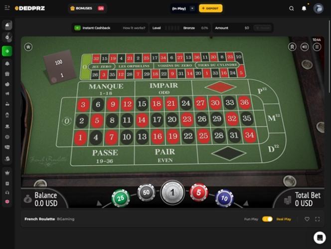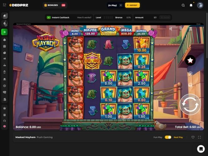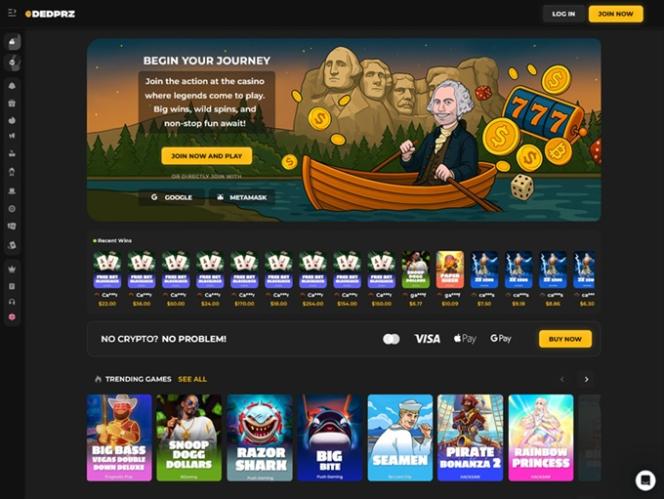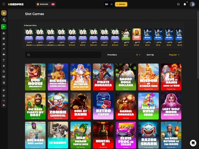 DEDPRZ не является исключением. Его платформа включает в себя все ожидаемые элементы минималистичного казино и отлично справляется с задачей обеспечения удобной и простой навигации по сайту. Темные фоны контрастируют с несколькими неоновыми цветами, которые уместно выделяют другие разделы и страницы казино.