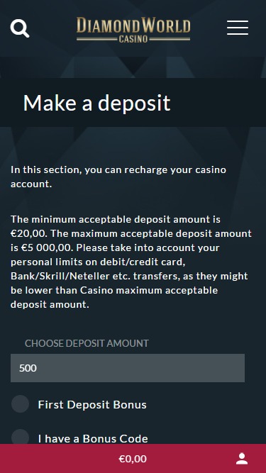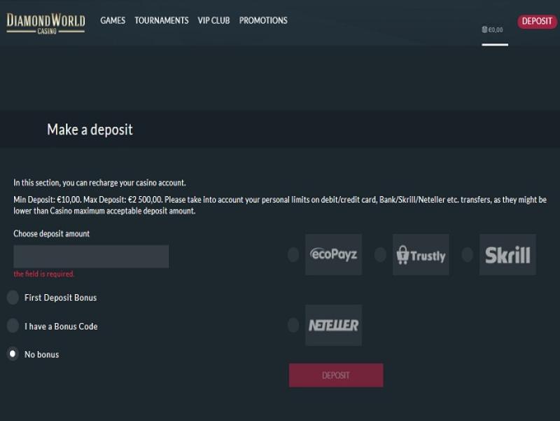 Казино Diamond World — это онлайн-букмекерская контора, открывшаяся в 2012 году и принадлежащая компании Fair Play Bets Limited. Казино ориентировано на европейский рынок и предлагает популярный джекпот, который можно выиграть в любой игре, а также аппаратный генератор случайных чисел, но подвергается критике за ограниченные возможности вывода средств и необходимость загрузки плагина Unity для игроков.Информация о казино