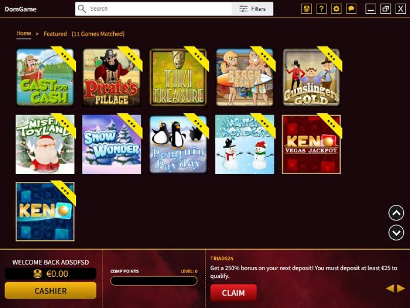Казино DomGame работает на программном обеспечении Rival , а игры предоставляются как в виде загружаемого программного обеспечения, так и в режиме мгновенной игры, позволяющем играть в веб-браузере.
