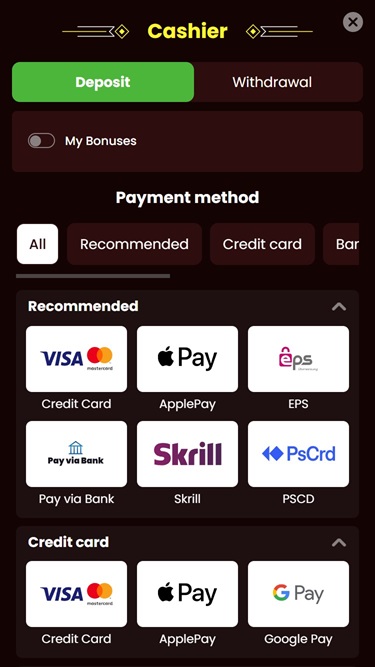 Помимо приветственного бонуса, игроков ждет множество других акций, таких как бонусы за пополнение счета, розыгрыши призов, внутренние турниры, вращения колеса удачи и игровые задания, за выполнение которых можно получить различные награды. Бренд регулярно обновляет программу акций, поэтому вы всегда можете рассчитывать на новые преимущества.