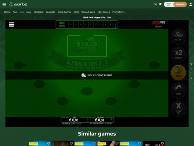 Казино Dublinbet работает на программном обеспечении Playtech, BetSoft, Evolution Gaming, Ezugi, Habanero Systems, iSoftBet, Oryx, Play'n GO, playson, Quickspin, Relax Gaming, Saucify, Thunderkick, Visionary iGaming, WM, Yggdrasil, Wazdan, GameArt, Booming Games, Stakelogic, Pragmatic Play, Nolimit City, Felt Gaming, Booongo, Air Dice, LuckyStreak, Spinomenal, Fantasma Games, SYNOT Games, Revolver Gaming, Spin Games, Spinmatic, BGAMING, Evoplay, OneTouch, Electric Elephant Games, Bulletproof Games, Gluck Games, Mascot Gaming, Spearhead Studios, Swintt, Mancala Gaming, SmartSoft Gaming, Blue Guru Games, Lady Luck Games, UP Games, Amusnet Interactive, bluberi, CT Interactive, Push Gaming, Tain, Genii, Gamomat, Authentic Gaming, Reflex Gaming, Storm Gaming Technology, Wild Streak Gaming, Golden Hero, 4ThePlayer, AvatarUX, ReelPlay, Japan Technicals Games, Rarestone Gaming, BB Games, Boomerang Studios, Hacksaw Gaming, Max Win Gaming, Bang Bang Games, Slotmill, SilverBack Gaming, Peter And Sons, Armadillo Studios, FlipLuck and Red Papaya , что обеспечивает ему огромный выбор игр, доступных игрокам через веб-платформу.Blackjack