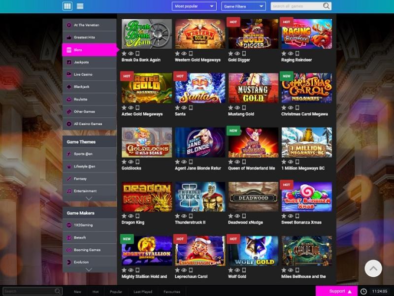 Основные категории игр: At the Venetian, Лучшие хиты, Слоты, Джекпоты, Казино с живыми дилерами, Блэкджек, Рулетка, Другие игры и Все игры казино.
