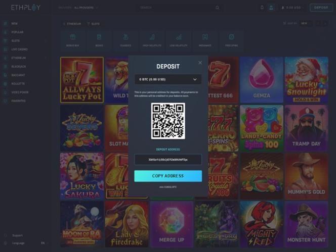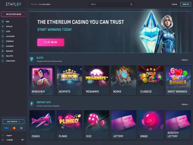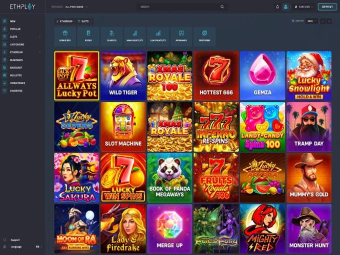 Хотя в казино ETHPLAY не так много поставщиков программного обеспечения на выбор, здесь все же представлено значительное количество игр, среди которых наиболее популярны Merge Up, Wild Heart, Sweet Rush Megaways, Alien Fruits, Wild Cash X9990, Bonanza Billion, Beer Bonanza, Book of Panda Megaways, Bone Bonanza, Tramp Day, Blackjack Side Bets, Lady Wolf Moon Megaways и Book of Kemet.