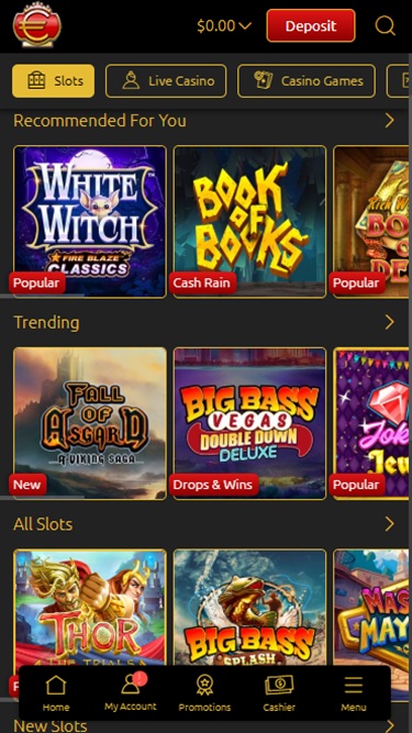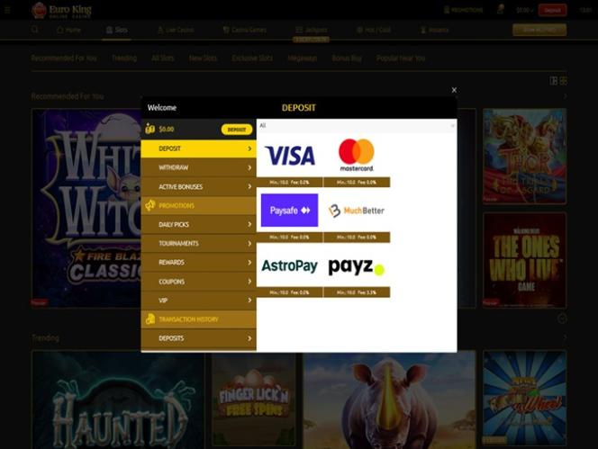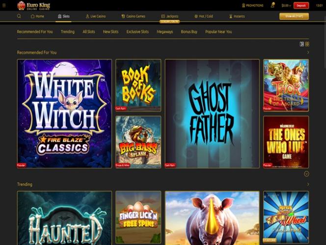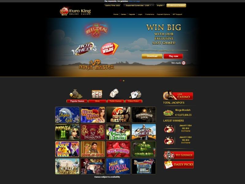 В казино EuroKing представлено большое количество игровых автоматов, а также множество прогрессивных джекпотов, главные призы которых могут достигать миллиона долларов.