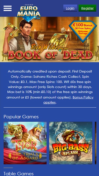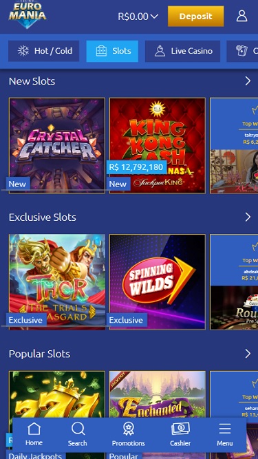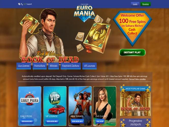 На сайте EuroMania представлены сотни слотов, включая широкий выбор классических и видеослотов от ведущих мировых разработчиков. Также доступны прогрессивные джекпоты на миллионы долларов, среди которых такие крупные призы, как Mega Moolah, Major Millions и другие.