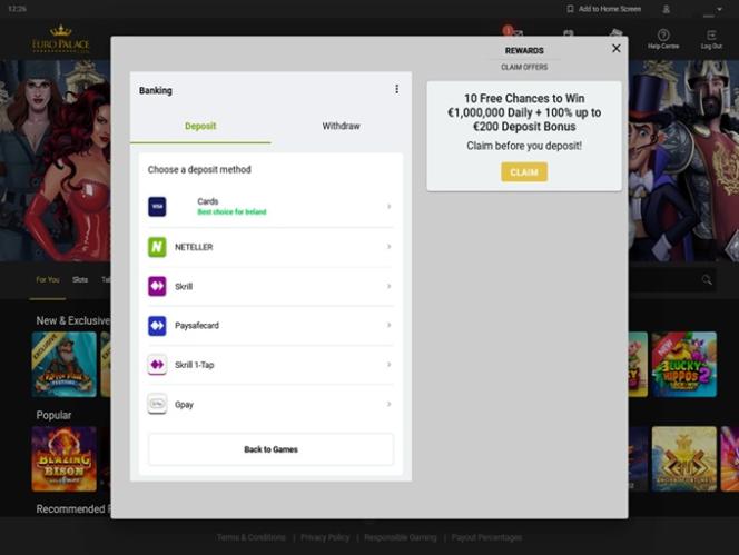 Казино Euro Palace работает на программном обеспечении Microgaming, Evolution Gaming, Rabcat, Pragmatic Play, Triple Edge Studios, Northern Lights Gaming, Stormcraft Studios, Switch Studios, Electric Elephant Games, All41 Studios, Gameburger Studios, Pulse 8 Studios, Neon Valley Studios, SpinPlay Games, Real Dealer Studios, GONG Gaming, On Air Entertainment, Buck Stakes Entertainment, Games Global, Old Skool Studios, Foxium, Just For The Win, PearFiction Studios, Slingshot Studios, Fortune Factory Studios, Crazy Tooth Studio, Alchemy Gaming, Snowborn Games, Gold Coin Studios, Half Pixel Studios, Eurostar Studios, Aurum Signature Studios and Area Vegas , которое предоставляет сотни различных игр, а также надежную игровую платформу. Игроки могут получить доступ к казино через веб-сайт Euro Palace или через загружаемое программное обеспечение, которое устанавливает клиент казино непосредственно на ваш компьютер. Обе платформы практически идентичны, и нет реального преимущества в выборе одной из них. Также доступно мобильное казино для тех, кто хочет играть в эту игру на своем компьютере или мобильном устройстве.