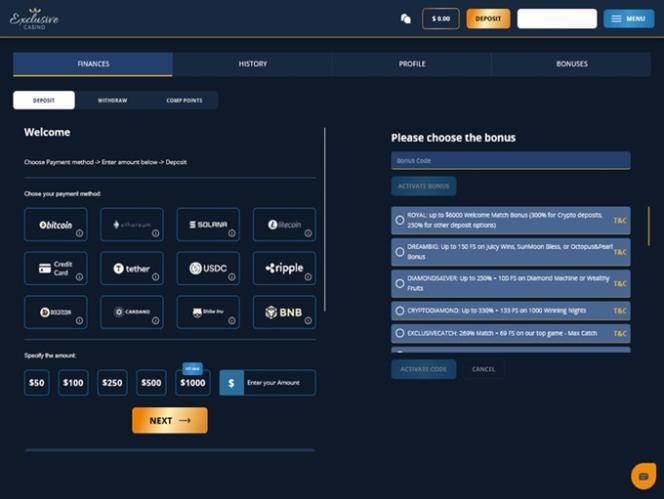 Я зашёл на сайт Exclusive Casino и поделился своими впечатлениями. Когда я впервые попал на сайт, он показался мне типичным онлайн-казино с большим выбором слотов и настольных игр. Сразу же были представлены крупные приветственные бонусы, что привлекло моё внимание, когда я решил, регистрироваться ли. В игровом лобби был огромный выбор игр, от слотов до игр с живыми дилерами, и мне понравилось, что я мог изучать разные типы игр в одном месте. Моё первое впечатление от Exclusive Casino – это обилие игр и бонусов, а регистрация и навигация по сайту были простыми. Если вам нравится большой выбор и регулярные акции, стоит взглянуть.