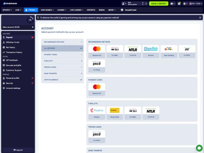 Казино Fairpari предлагает различные способы оплаты, такие как Polkadot, Dash, Skrill, Netteler, Visa и MasterCard , а также множество криптовалют, таких как Bitcoin, Bitcoin Cash, Cardano, Dogecoin, Ethereum, Litecoin, Ripple, Solana, Tether, Ton, Tron, USD Coin и Zcash.