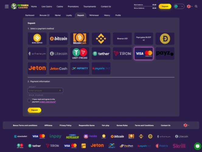 Одно из главных преимуществ этого оператора заключается в том, что он предлагает игрокам множество различных способов оплаты. Это значительно расширяет доступность платформы, позволяя игрокам использовать традиционные методы, такие как Visa, Mastercard, банковский перевод, Jeton,Neteller, Revolut, Skrill, MiFinity, Paysafecard и другие.