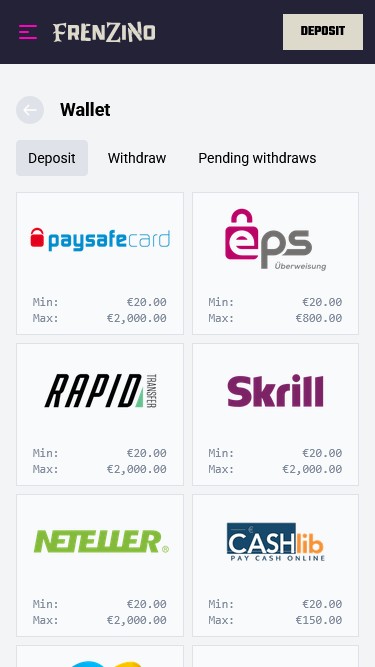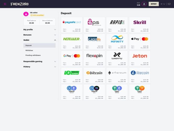Если вам нравится использовать криптовалюты для пополнения и вывода средств, вас обрадует новость о том, что Frenzino принимает множество криптовалют, таких как Bitcoin, Ethereum и USDT.